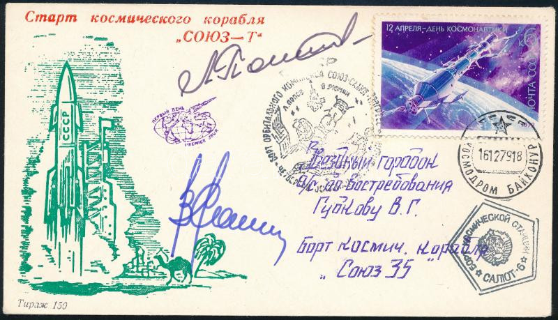 Valerij Rjumin (1939- ) és Leonyid Popov (1945- ) szovjet űrhajósok aláírásai emlékborítékon / Signatures of Valeriy Ryumin (1939- ) and Leonid Popov (1945- ) Soviet astronauts on envelope
