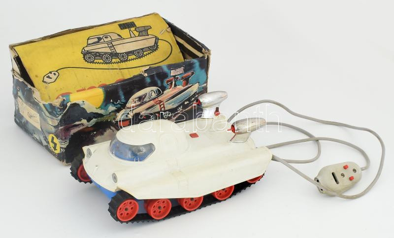 cca 1965 MSB Omega 2 retró NDK gyártmányú távirányítós lánctalpas holdjáró. Korának megfelelő állapotban, egy-két kis alkatrészhiánnyal, nincs kipróbálva (valószínűleg nem működik). Eredeti, sérült dobozában, 24,5x14x10,5 cm. Ritka, gyűjtői darab.