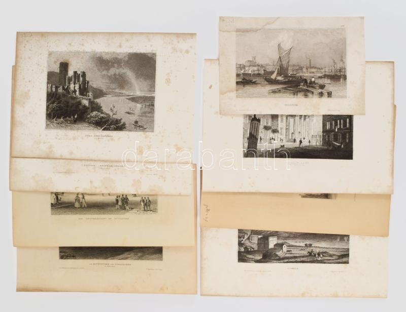 Beschreibung: 8 db vegyes külföldi helyszíneket ábrázoló acélmetszet, változó méretben és állapotban, részben foltos