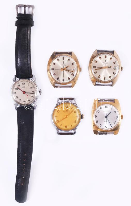 Beschreibung: 5 db kézi felhúzós férfi karóra, Poljot, Vostok, UMF. Az UMF kivételével mind működik.