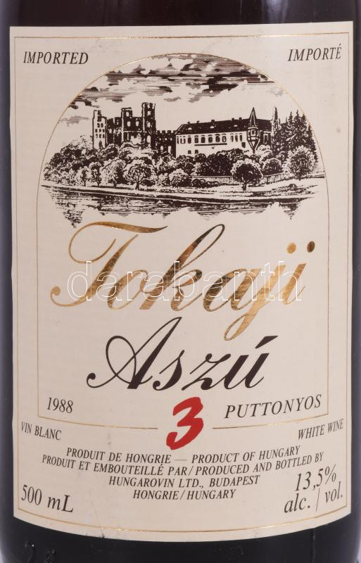 1988 Tokaji Aszú, Hungarovin, 3 puttonyos, 0,5l. https://www.darabanth.com/de/514-Auktion-Philatelie-Postkarten-Numismatik-Kunstwerke-Bucher-Schreibwaren-Schmuck/515.0/Kunst-Dokumente-andere-Sammelgebiete/Vintage-Weine-Getranke~96/1988-Tokaji-Aszu-Hungarovin-3-puttonyos-0-5l~II3461174