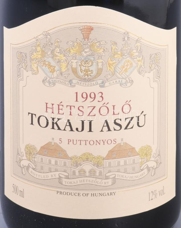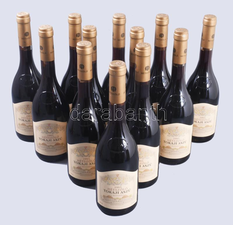 1993 Hétszőlő 5 puttonyos Tokaji Aszú, 12 db bontatlan palack édes desszertbor, eredeti kartondobozban, pincében tárolt, 12%, 12x0,5l.
