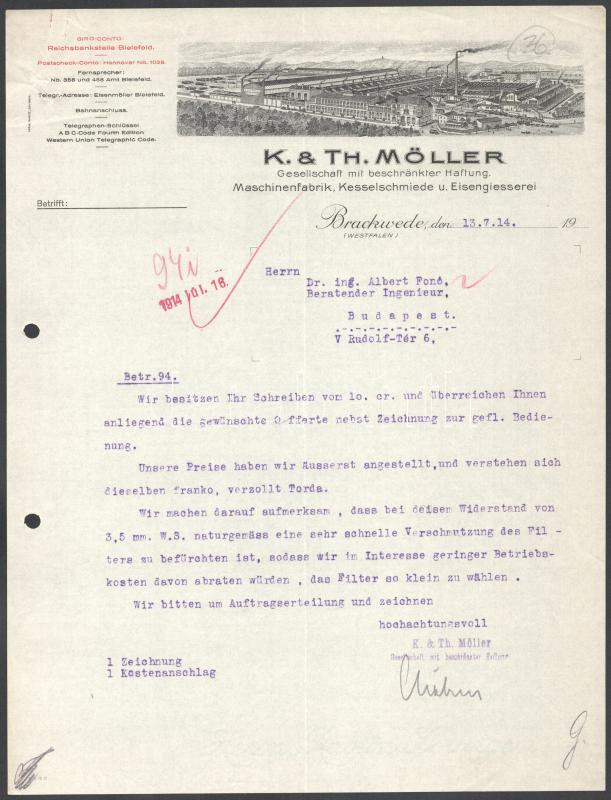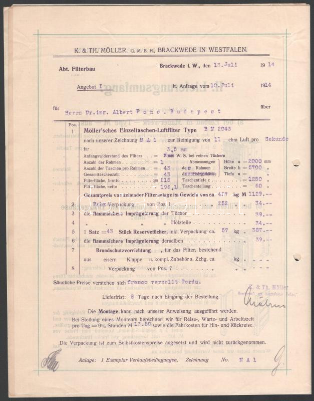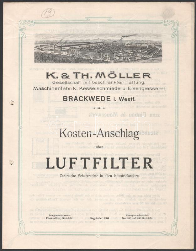 1914 Brackwede (Bielefeld), K. & Th. Möller Maschinenfabrik, Kesselschmiede u. Eisengiesserei német nyelvű fejléces üzleti levél, tájékoztató prospektus és műszaki rajz (levegőszűrő)