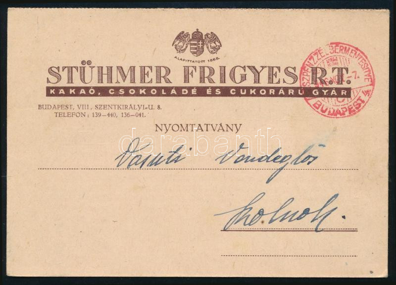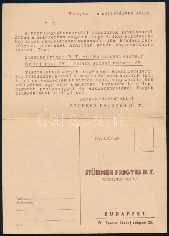 1946 A budapesti Stühmer Frigyes Rt. édességgyár kétlapos, válasz-levelezőlapos nyomtatványa arról, hogy a háború után ismét meg tudják kezdeni a vidéki rendelések teljesítését, postán elküldve, szép állapotban