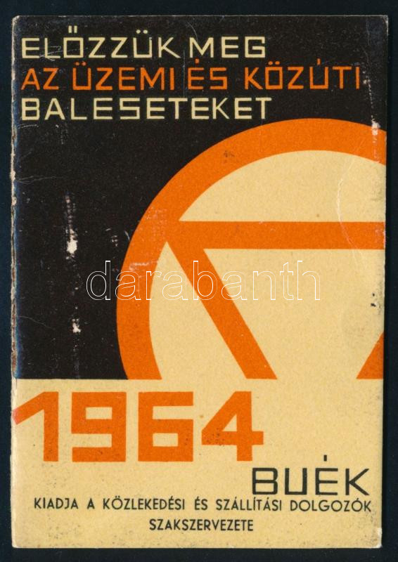 1964 ,,Előzzük meg az üzemi és közúti baleseteket", zsebnaptár, kiadja a Közlekedési és Szállítási Dolgozók Szakszervezete. Bp., Terv-ny., 16 p. Tűzött papírkötés, kissé viseltes borítóval.