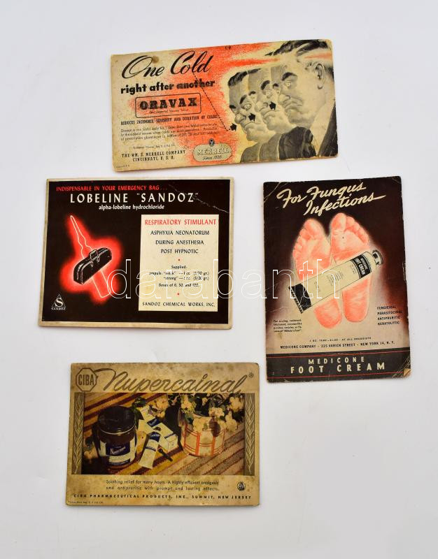 Beschreibung: 4 db angol nyelvű gyógyszerreklám, viseltes állapotban, 16x11 cm körüli méretben