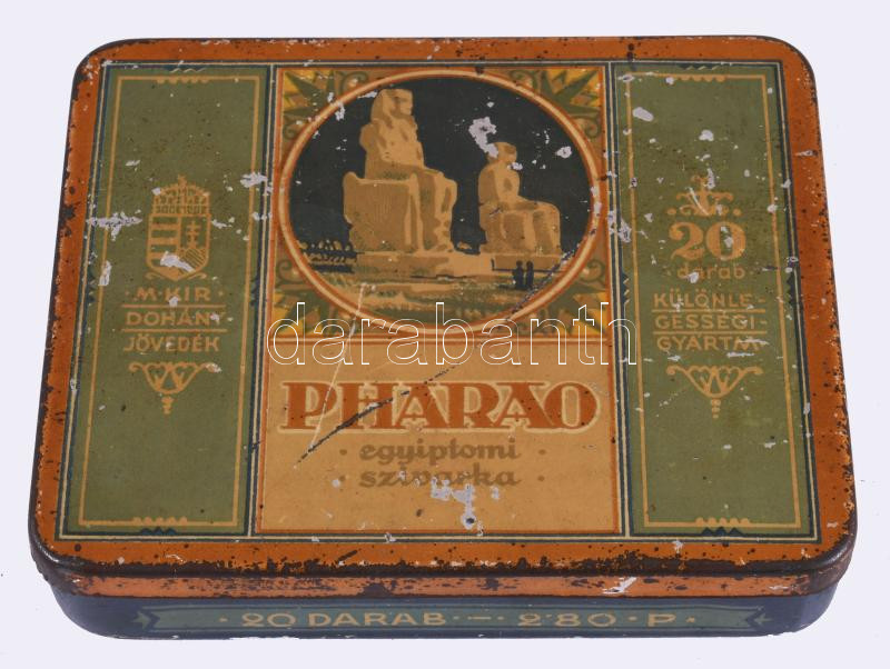Pharao egyiptomi szivarka fémdoboz, kopott, 15x12 cm https://www.darabanth.com/de/514-Auktion-Philatelie-Postkarten-Numismatik-Kunstwerke-Bucher-Schreibwaren-Schmuck/515.0/Kunst-Dokumente-andere-Sammelgebiete/Werbungen~73/Pharao-egyiptomi-szivarka-femdoboz-kopott-15x12-cm-3Cbr-3E~II3457288