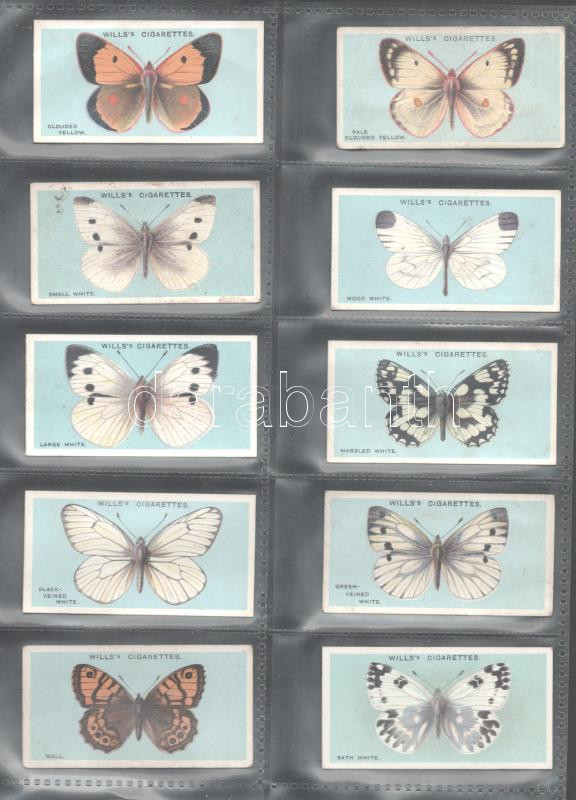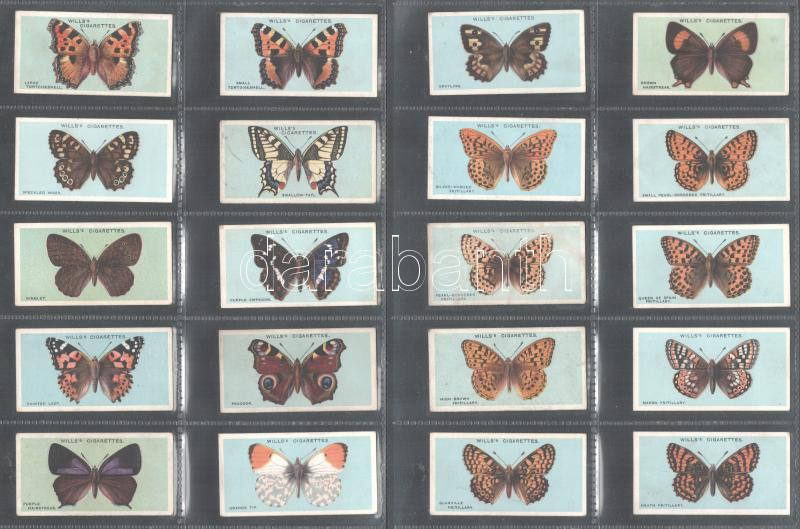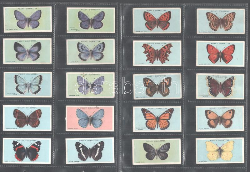 Wills's Cigarettes brit cigaretta-gyűjtőkártyák, 50 db-os komplett sorozat (pillangók), albumlapokon / British cigarette cards, complete series of 50 (Butterflies), in album sheets