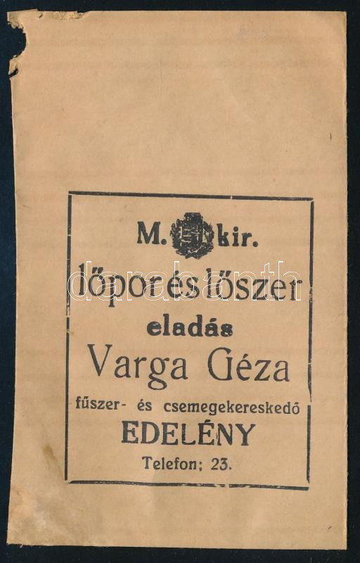 ca 1930 M. kir. lőpor és lőszer eladás Edelény, Varga Géza reklámos pa... https://www.darabanth.com/de/514-Auktion-Philatelie-Postkarten-Numismatik-Kunstwerke-Bucher-Schreibwaren-Schmuck/515.0/Kunst-Dokumente-andere-Sammelgebiete/Werbungen~73/ca-1930-M-kir-lopor-es-loszer-eladas-Edeleny-Varga-Geza-reklamos-papirtasak-8x12-cm~II3436728