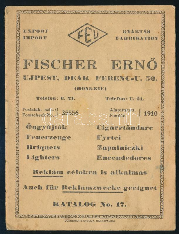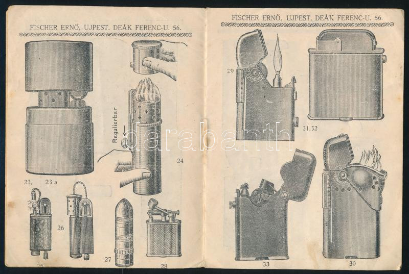 ca 1930 Öngyújtók képes katalógusa. 12 oldalon. Fischer Ernő Ujpest. https://www.darabanth.com/de/514-Auktion-Philatelie-Postkarten-Numismatik-Kunstwerke-Bucher-Schreibwaren-Schmuck/515.0/Kunst-Dokumente-andere-Sammelgebiete/Werbungen~73/ca-1930-Ongyujtok-kepes-katalogusa-12-oldalon-Fischer-Erno-Ujpest~II3464958