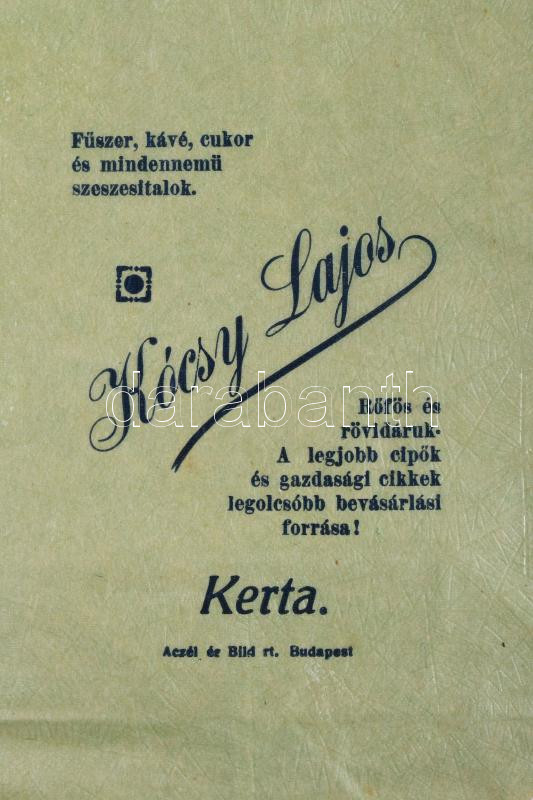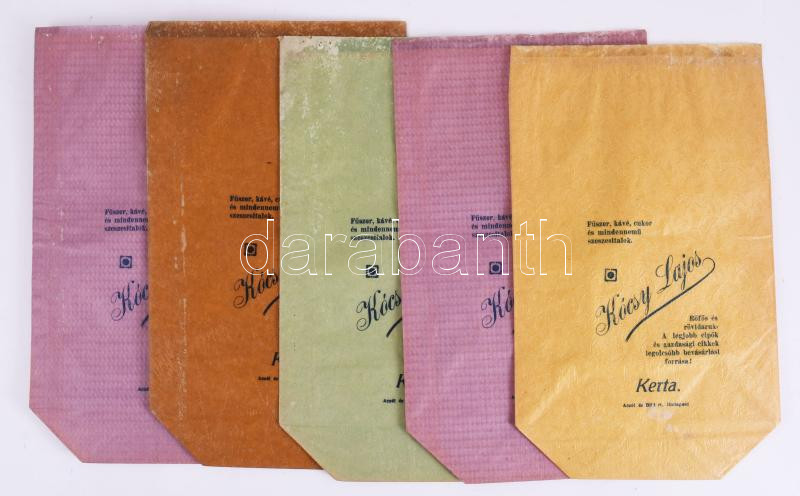 cca 1930 Kerta, Kócsy Lajos vegyeskereskedő reklámos papírtasakjai, 5 ... https://www.darabanth.com/de/514-Auktion-Philatelie-Postkarten-Numismatik-Kunstwerke-Bucher-Schreibwaren-Schmuck/515.0/Kunst-Dokumente-andere-Sammelgebiete/Werbungen~73/cca-1930-Kerta-Kocsy-Lajos-vegyeskereskedo-reklamos-papirtasakjai-5-db-kulonfele-szinekbe~II3456233
