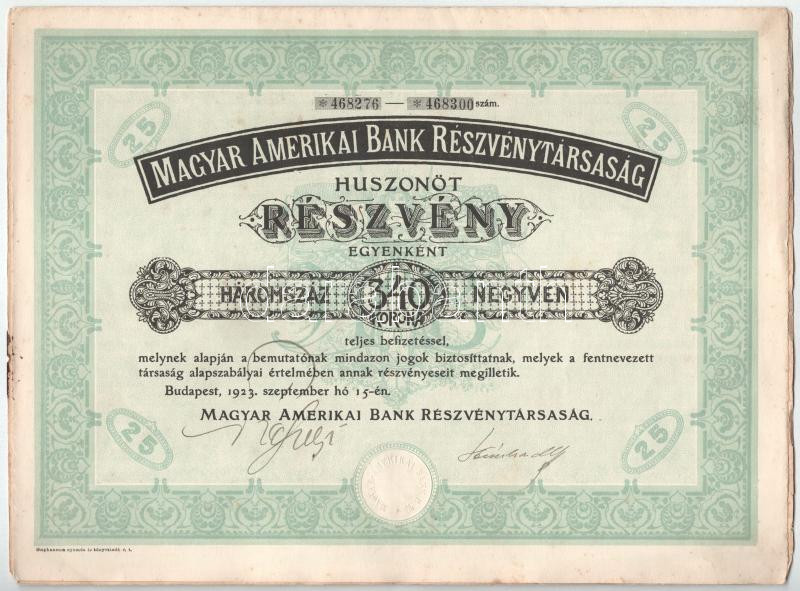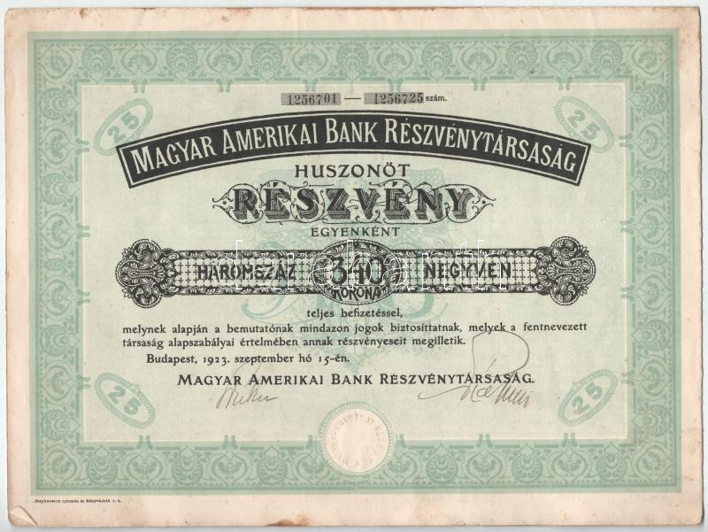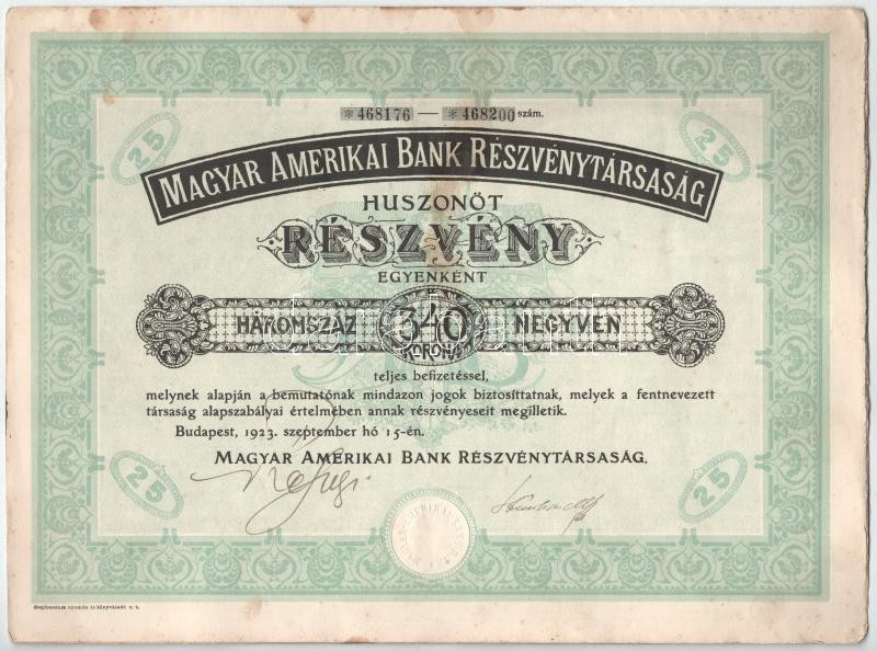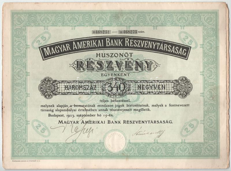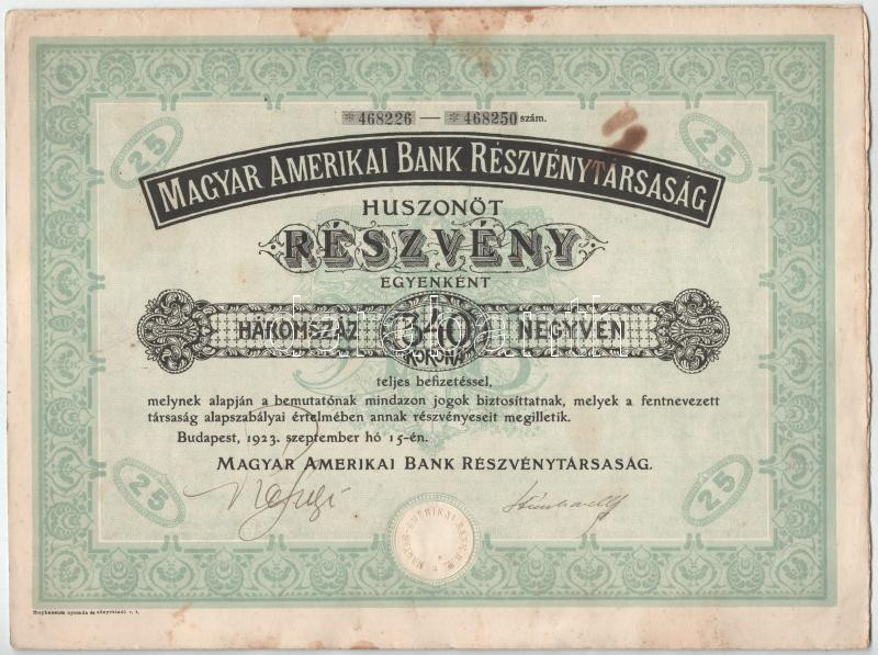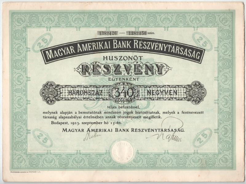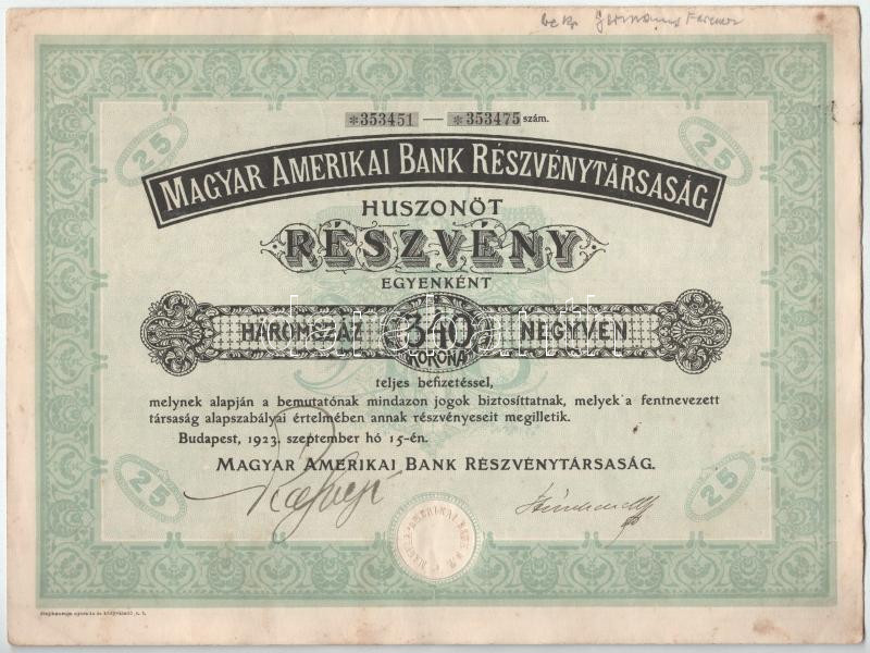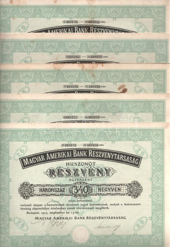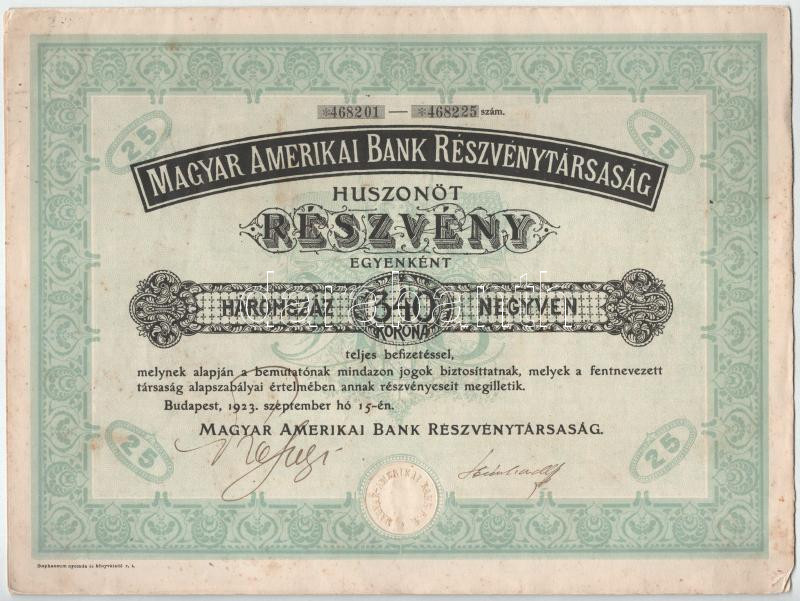 1923. Budapest "Magyar Amerikai Bank Részvénytársaság" 25 részvénye egyben, egyenként 340K-ról (8x), szelvényekkel és szárazpecséttel. Ebből 5db sorszámkövető: "468176 - 468300" között T:XF,VF