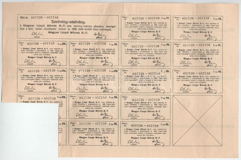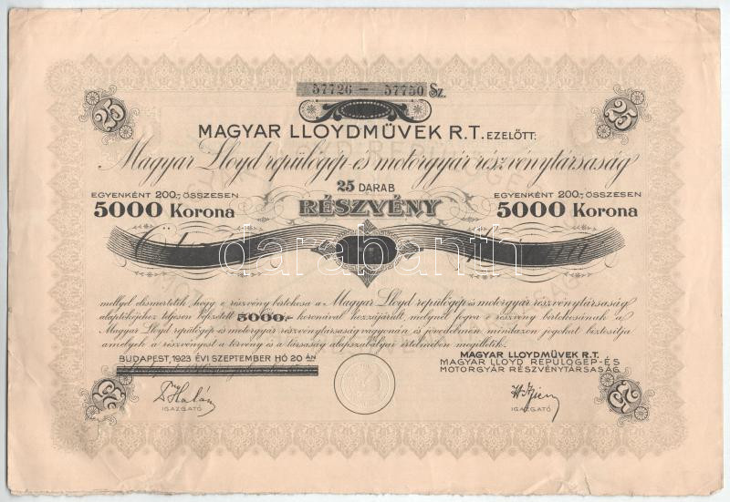 1923. Budapest "Magyar Llyod Művek Rt." felülbélyegezve a "Magyar Llyod repülőgép- és motorgyár részvénytársaság" részvényén, huszonöt darab részvény egyben, összesen 5000K-ról, szelvényekkel, szárazpecséttel T:F restaurált