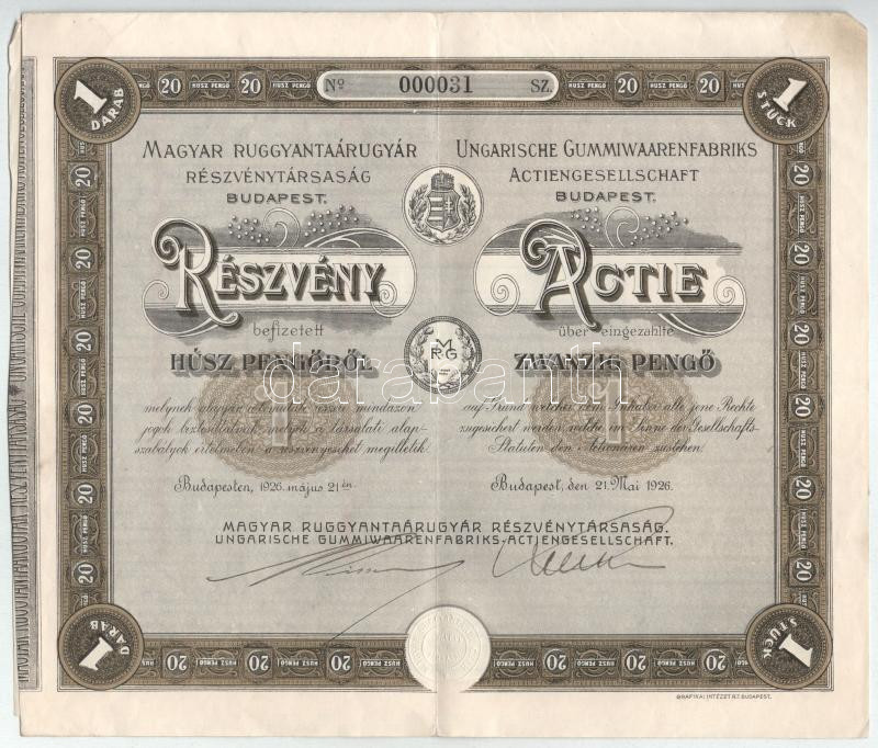1926. Budapest "Magyar Ruggyantaárugyár Részvénytársaság" ré... https://www.darabanth.com/de/514-Auktion-Philatelie-Postkarten-Numismatik-Kunstwerke-Bucher-Schreibwaren-Schmuck/515.0/Numismatik/Aktien-und-Tickets~1307/1926-Budapest-3Cem3EMagyar-Ruggyantaarugyar-Reszvenytarsasag3Cem3E-reszvenye-20P-rol-alacs~II3481986