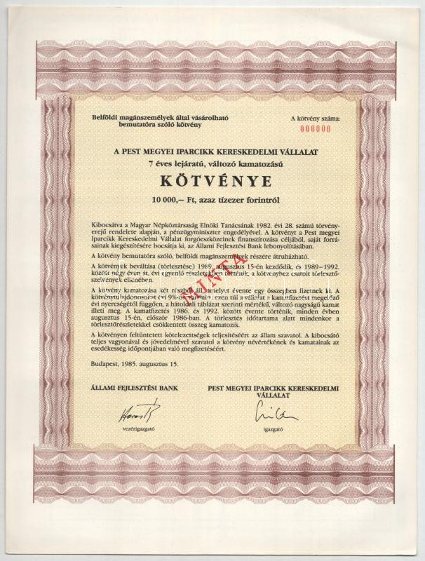 1985. Budapest "A Pest Megyei Iparcikk Kereskedelmi Vállalat"... https://www.darabanth.com/de/514-Auktion-Philatelie-Postkarten-Numismatik-Kunstwerke-Bucher-Schreibwaren-Schmuck/515.0/Numismatik/Aktien-und-Tickets~1307/1985-Budapest-A-Pest-Megyei-Iparcikk-Kereskedelmi-Vallalat-kotvenye-10000Ft-rol-plus-Kisvarda-~II3062900