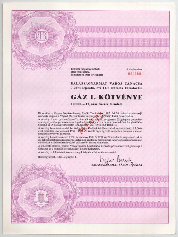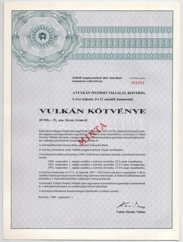 Beschreibung: 1985. Budapest "A Pest Megyei Iparcikk Kereskedelmi Vállalat" kötvénye 10.000Ft-ról + Kisvárda 1986. "A Vulkán Öntödei Vállalat Kisvárda - Vulkán Kötvénye" 10.000Ft-ról, "MINTA", szelvényekkel + Balassagyarmat 1987. "Balassagyarmat Város Tanácsa - Gáz I. Kötvénye" 10.000Ft-ról, "MINTA", szelvényekkel T:UNC