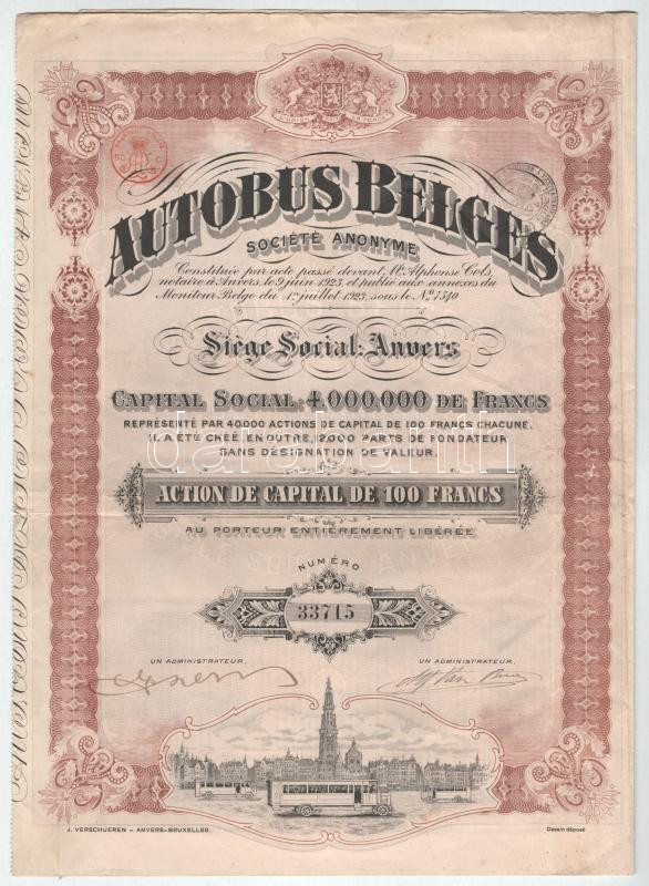 Belgium 1923. Antwerpen "Belga Busz Részvénytársaság" 100Fr ... https://www.darabanth.com/de/514-Auktion-Philatelie-Postkarten-Numismatik-Kunstwerke-Bucher-Schreibwaren-Schmuck/515.0/Numismatik/Aktien-und-Tickets~1307/Belgium-1923-Antwerpen-Belga-Busz-Reszvenytarsasag-100Fr-erteku-reszvenye-belyegzessel~II3465135