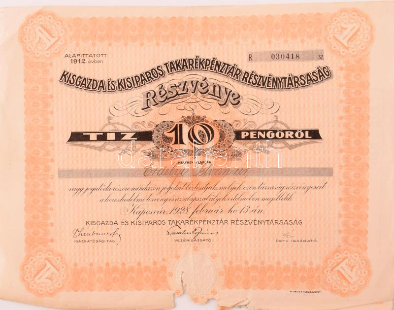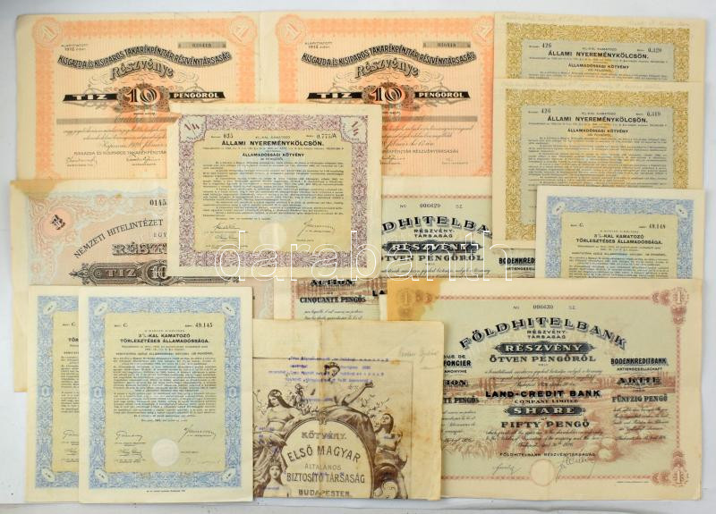 Vegyes 12db-os részvény és kötvény tétel, mind sérülésekkel, de közte jobb darabok is: 1928. "Kisgazda és Kisiparos Takarékpénztár Részvénytársaság", 1926. "Nemzeti Hitelintézet Részvénytársaság", 1926. "Földhitelbank Részvénytársaság"