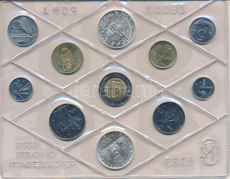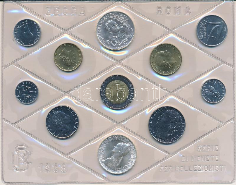 Olaszország 1989. 1L-500L (11xklf) forgalmi sor fóliatokban és műbőrtokban, tanúsítvánnyal. Benne: 1989R 500L Ag "Kolumbusz hajói", 1989R 500L Ag "Tommaso Campanella halálának 350. évfordulója" T:UNC