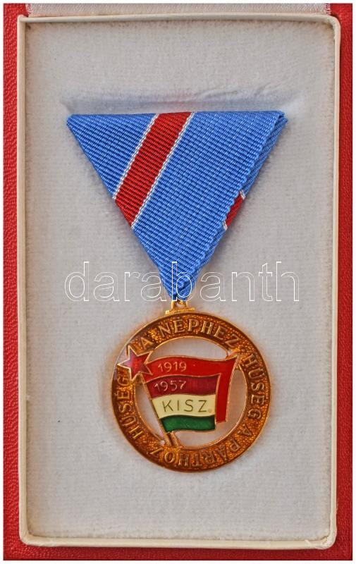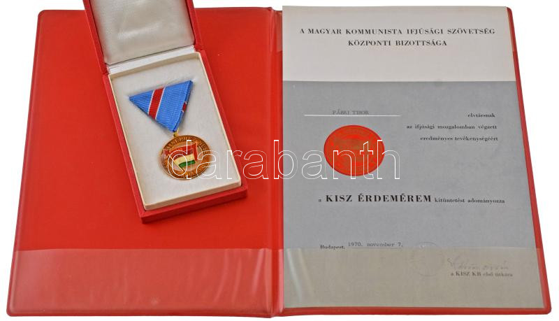Beschreibung: 1970. "KISZ - Hűség a Néphez Hűség a Párthoz " műgyantás kitüntetés mellszalagon, miniatűrrel, eredeti tokban, adományozói okirattal T:UNC