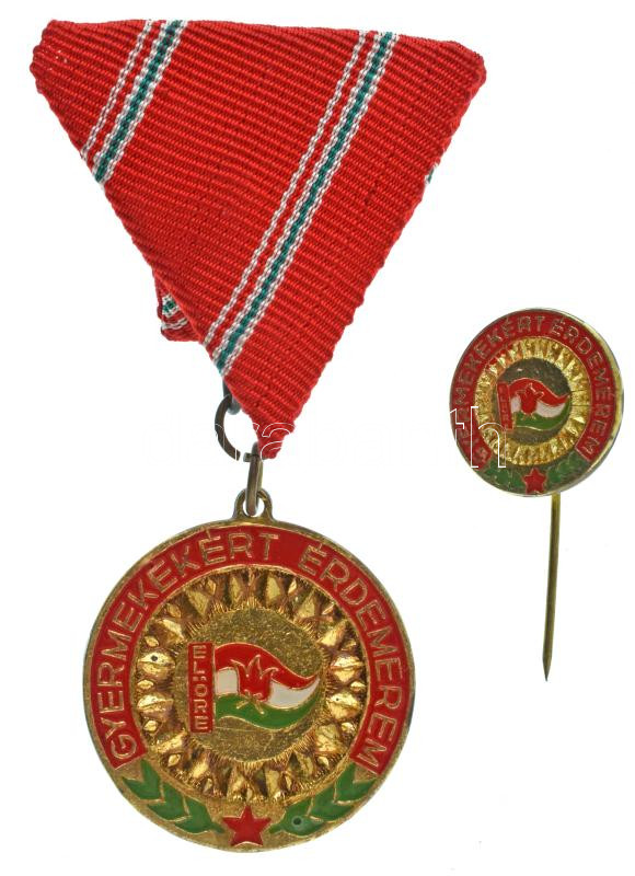 Beschreibung: 1980 k. "Gyermekekért Érdemérem" műgyantás fém Úttörő kitüntetés mellszalagon, miniatűrrel T:XF