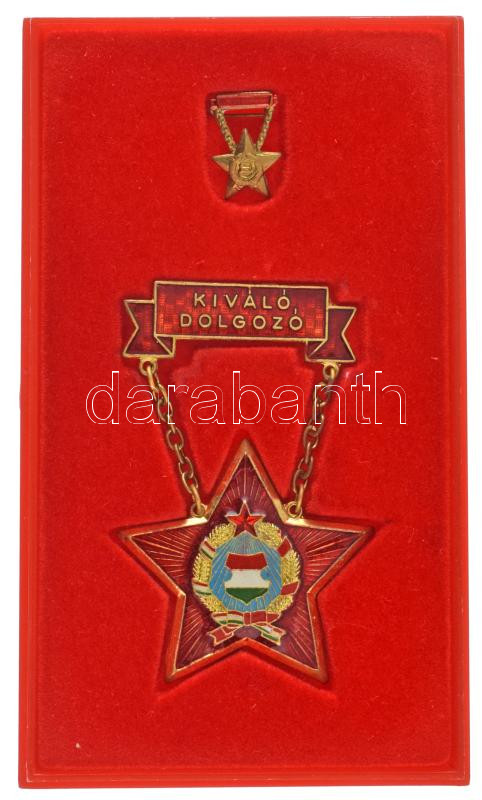 DN (1960-1970 k) "Kiváló Dolgozó" zománcozott fém kitüntetés, miniatűrrel eredeti tokban + a hozzá tartozó viselésre jogosító, névre szóló, kitöltött igazolvány T:AU