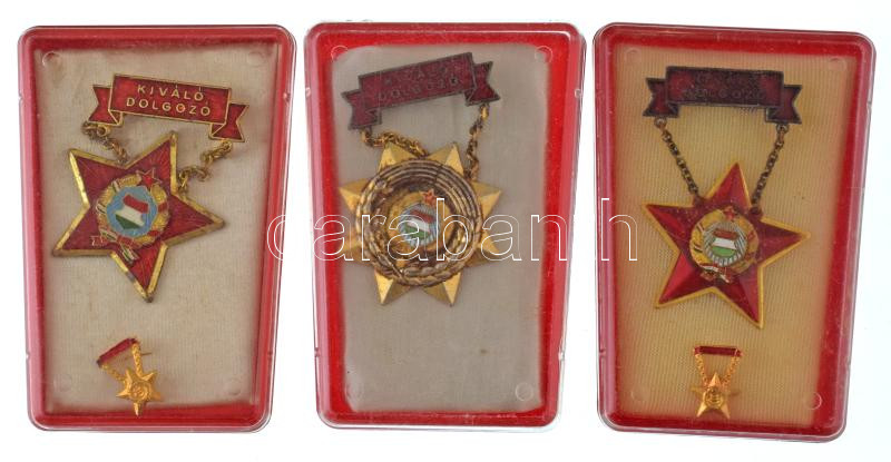 DN (1970-1980 k) "Kiváló Dolgozó" (3xklf) aranyozott bronz kitüntetés, nem hozzá való rátéttel, műanyag tokban + zománcozott fém kitüntetés, miniatűrrel műanyag tokban + műgyantás fém kitüntetés, miniatűrrel műanyag tokban T:AU-VF, aranyozás kopás