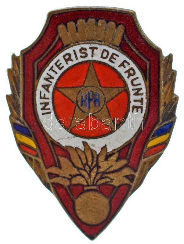 Románia 1950 k. "Infanterist de Frunte (Kiváló gyalogos)" zománcozott bronz kitüntető jelvény csavaros hátlappal, gravírozott "12921" sorszámmal (25x35mm) T:XF karcok a zománcozott felületen