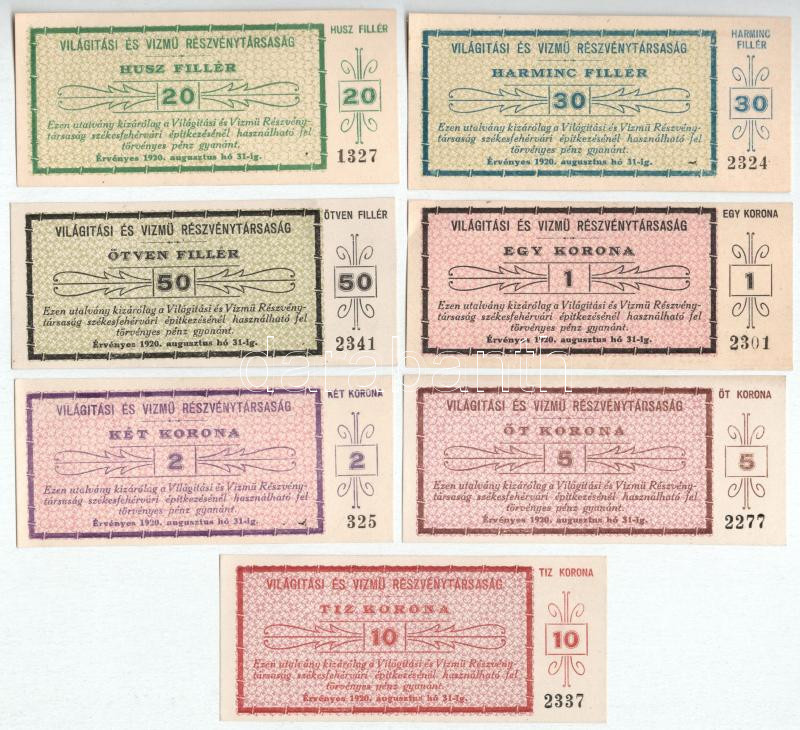 1920. Székesfehérvár 20f + 30f + 50f + 1K + 2K + 5K + 10K "Világítási és Vízmű Részvénytársaság". Teljes sor! T:UNC,AU