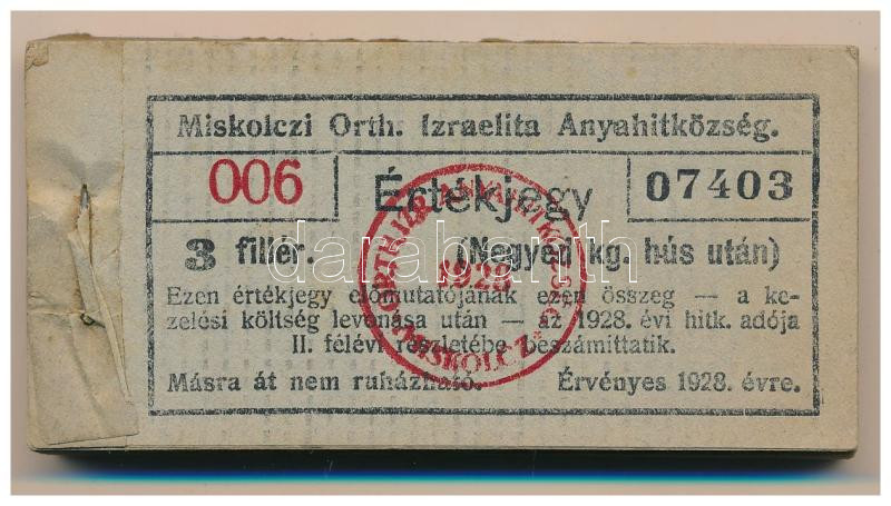 1928. Miskolc 3f "Miskolczi Orth. Izraelita Anyahitközség" vágatási jegy / értékjegy 1/4kg hús után (98x), közel teljes tömb "006 07403 - 006 07500" között T:AU, sarokhajlás, első darabon szennyeződés