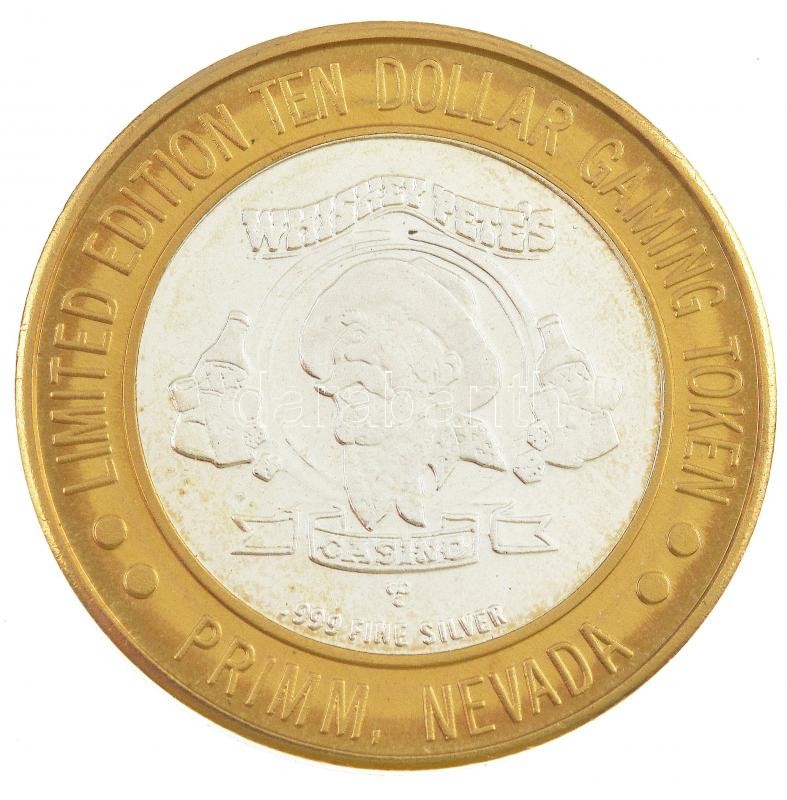 Amerikai Egyesült Államok / Las Vegas DN 10$ "Whiskey Pete's / Bonnie és Clyde" Ag kaszinózseton sárgaréz gyűrűben (br.36,65g/0.999/43mm) T:PP patina USA / Las Vegas ND 10 Dollars "Whiskey Pete's / Bonnie & Clyde" Ag casino gaming token in brass frame (br.36,65g/0.999/43mm) C:PP patina