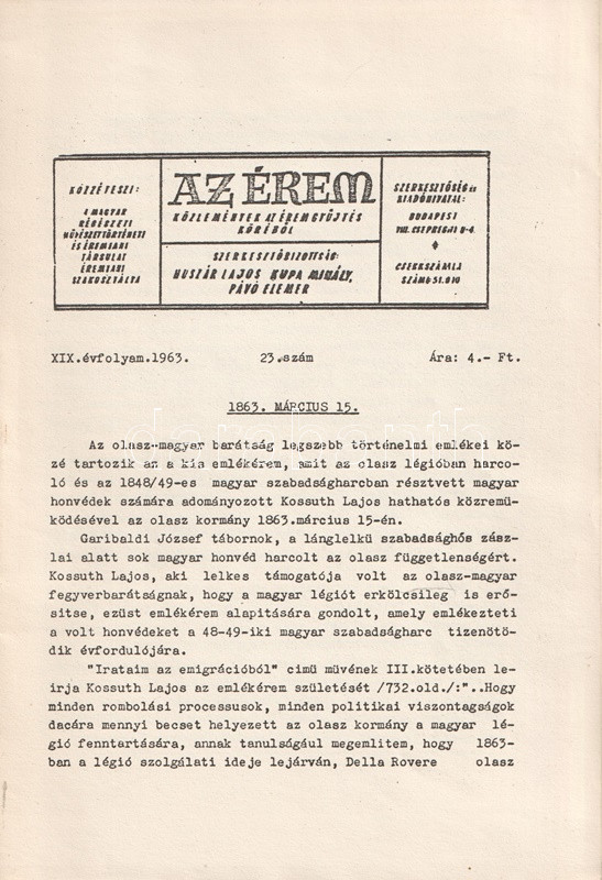 Az Érem. Közlemények az éremgyűjtés köréből. Szerkeszti Huszár Lajos, Kupa Mihály és Pávó Elemér. 23. szám. (1963).