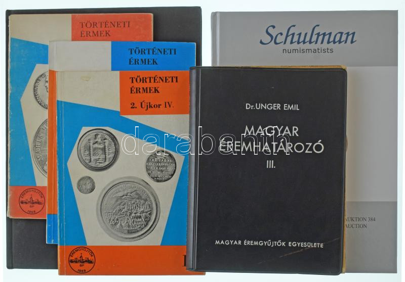Dr. Unger Emil: Magyar éremhatározó III. Magyar Éremgyűjtők Egyesülete, Budapest, 1976. Második, átdolgozott kiadás. Használt, szép állapotban + B. Sey Katalin - Gedai István: Éremkincsek - Magyar Nemzeti Múzeum Kincsei. Magyar Helikon, Corvina, Budapest, 1972. Jó állapotban, de védőborító nélkül + "Történeti érmék" három kötete (5., 12., 14.) használt állapotban + Schulman 2025. márciusi árverési katalógus újszerű állapotban