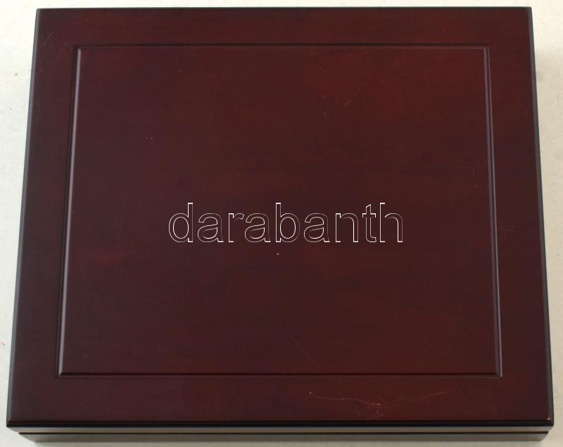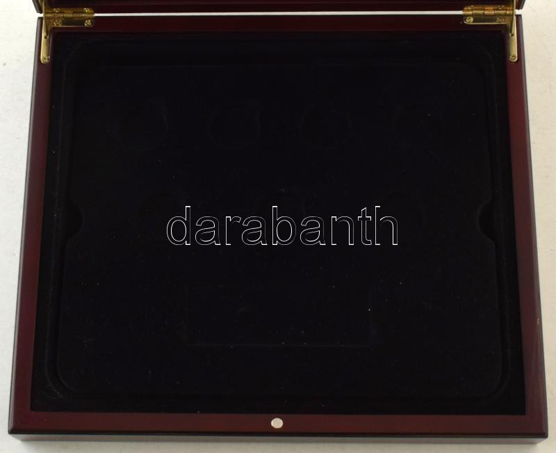 Mahagóni fa érmetartó kazetta bársonybéléssel, 1db kivehető- és 1db beépített tálcával "A világ legkisebb aranyérméi" sorozat számára, összesen 7db ~29mm-es, és 1db ~121x204mm-es férőhellyel. Beépített dekoratív nagyítóval. Használt de újszerű állapotban.