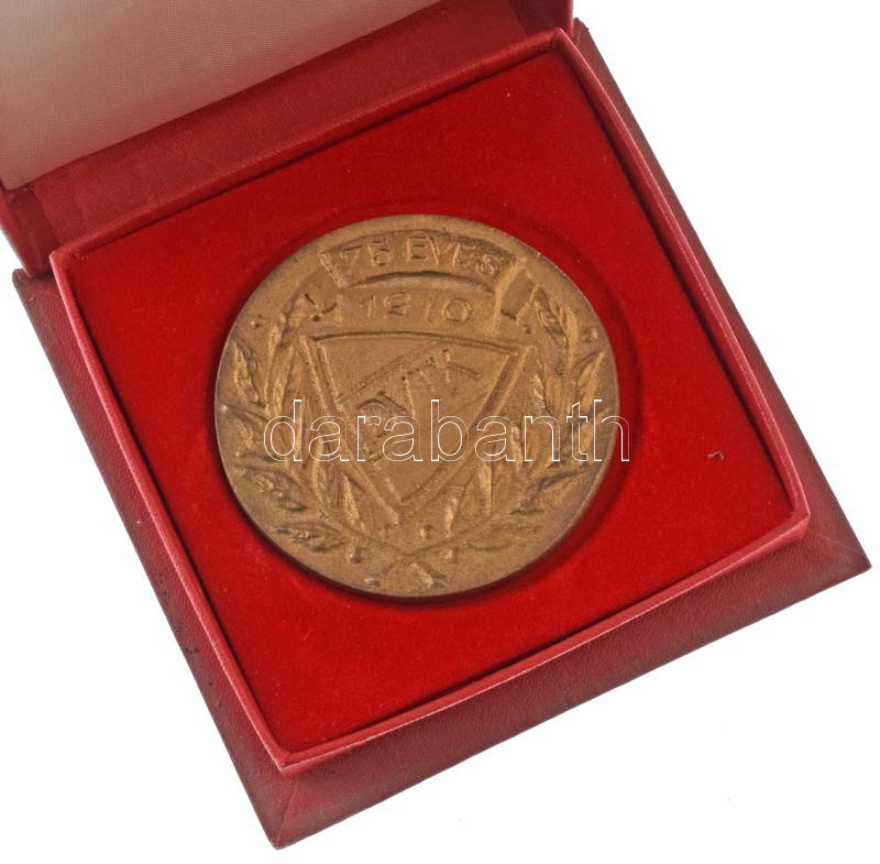 1985. "75 éves a DVTK" egyoldalas, öntött bronz emlékérem eredeti "DVTK" feliratú tokban, a Diósgyőri Vasgyárak TK fennállásának 75. évfordulója alkalmából (116mm) T:AU