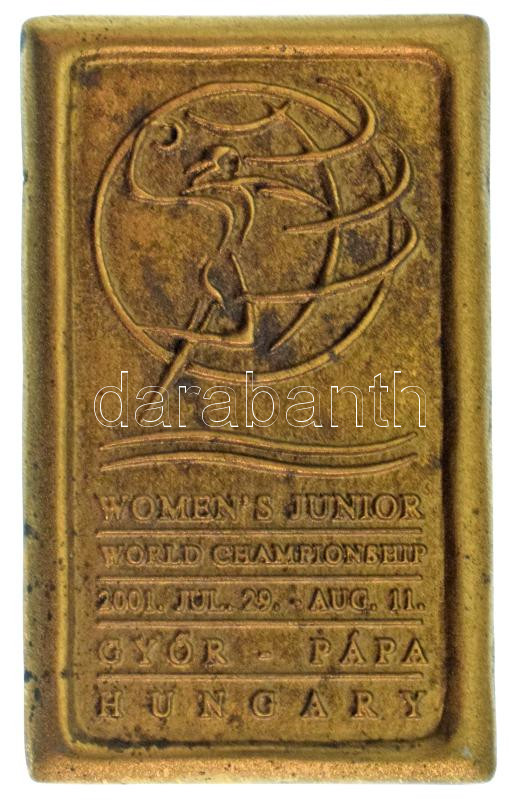 2001. Női Junior Világbajnokság "Women's Junior World Championship 2001. Júl. 29. - Aug. 11. Győr - Pápa Hungary" egyoldalas, aranyozott Al emlékplakett sérült műanyag tokban (52x84mm) T:AU,XF