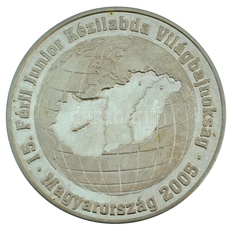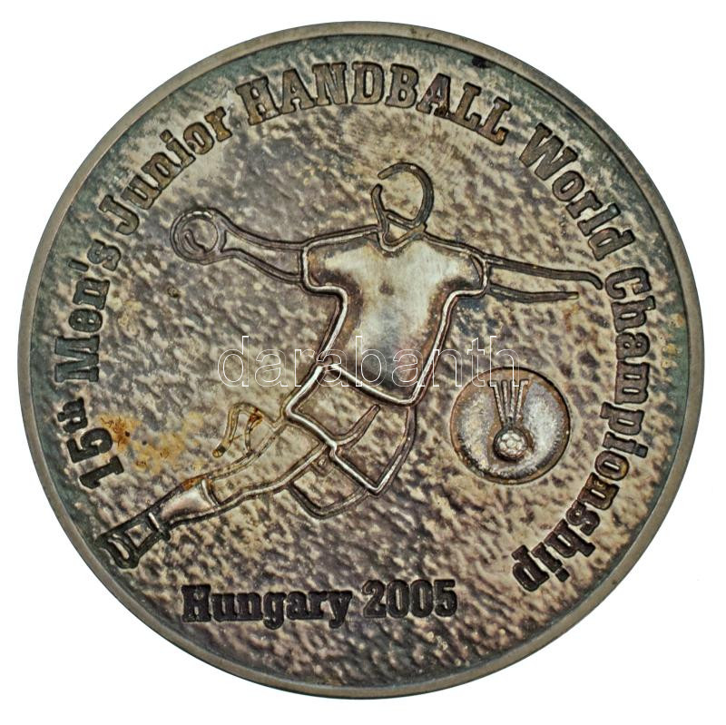 Hungary 2005. "15th Men's Junior Handball World Championship - Hungary 2005" two-sided Ag commemorative medallion in decorative case, hallmarked at the edge (100,72g/0.925/60mm) C:AU, patina