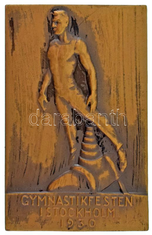 Sweden 1930. "Gymnastikfesten I Stockholm" one-sided bronze commemorative plaque with "WESTINS STOCKHOLM" maker's mark on the reverse, in original cardboard box, without lid (43x66mm) C:AU,XF