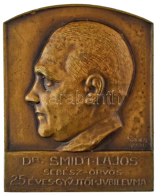 Sződy Szilárd (1878-1939) 1936. "Dr. Smidt Lajos sebész-orvos 25 éves gyűjtői jubileuma / és első szombathelyi hadikiállításának emlékére" kétoldalas bronz emlékplakett, peremen "LUDVIG BUDAPEST" gyártói jelzéssel.