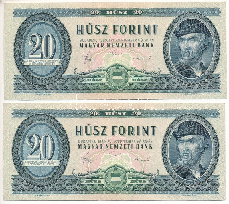 1980. 20Ft (2x) sorszámkövetők "C 259 073976 - C 259 073977"... https://www.darabanth.com/de/514-Auktion-Philatelie-Postkarten-Numismatik-Kunstwerke-Bucher-Schreibwaren-Schmuck/515.0/Numismatik/Ungarische-Banknoten~1309/1980-20Ft-2x-sorszamkovetok-C-259-073976-C-259-073977-TAU-hullamos-papir3Cbr-3E-Adamo-F~II3475655