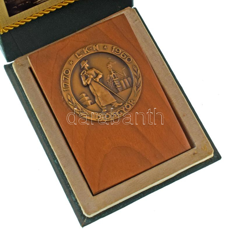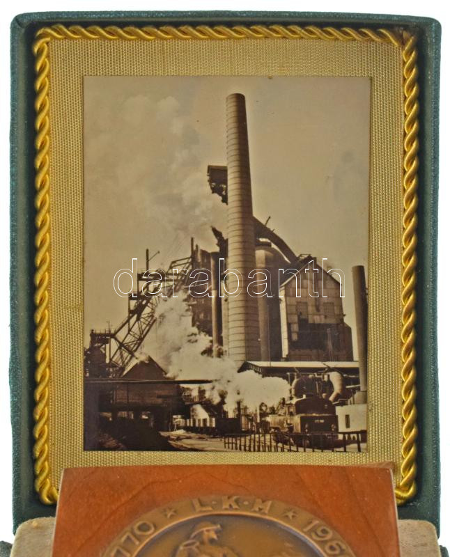 1960. Lenin Kohászati Művek "1770 L.K.M. 1960 - Diósgyőr" bronz emlékérem (50mm) fa talapzaton (~67x96mm), eredeti díszdobozban a kohó régi fotójával T:AU
