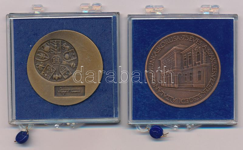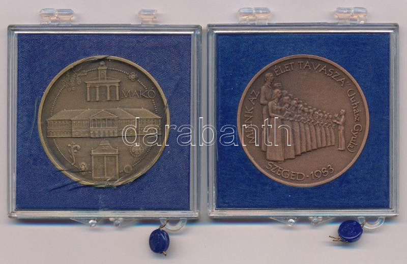 1983. ",,Miénk az élet tavasza" (Juhász Gyula) Szeged 1983 / 75 éves a Szakszervezetek Szegedi Általános Munkáskórusa" kétoldalas bronz emlékérem, plombált műanyag tokban (42,5mm) + Lapis András (1942-) DN "Makó / Szeged Tourist" kétoldalas bronz emlékérem, sérült műanyag tokban (42,5mm) T:UNC,AU