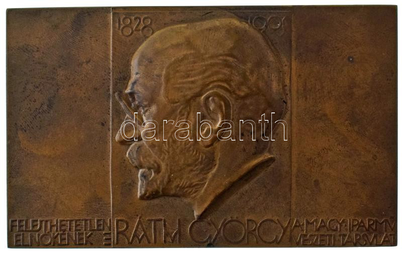 Beck Ötvös Fülöp (1873-1945) ~1905. "Felejthetetlen elnökének - Ráth György 1828-1905 - A Magyar Iparművészeti Társulat / Hit lakta szívét és nagy akarat, minden java a nemzeté maradt" kétoldalas bronz plakett (54x87mm) T:AU