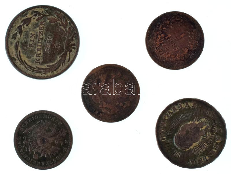 Hungary 1763. Copper Denier "Maria Theresa / Closed crown" + 1872KB 1kr Cu + 1885KB 1kr Cu + Austria 1780W 1 Kreuzer Cu "Maria Theresia" Vienna + 1860A 1kr Cu Vienna C:VF,F, patina