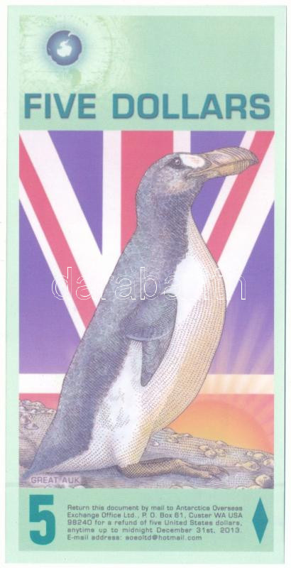 Anta... https://www.darabanth.com/de/514-Auktion-Philatelie-Postkarten-Numismatik-Kunstwerke-Bucher-Schreibwaren-Schmuck/515.0/Numismatik/Weltweit-Banknoten~1316/Antarktisz-2008-5USD-fantazia-bankjegy-SPC13004-TUNC3Cbr-3E-Antarctica-2008-5-Dollars-fantasy-ba~II3402748