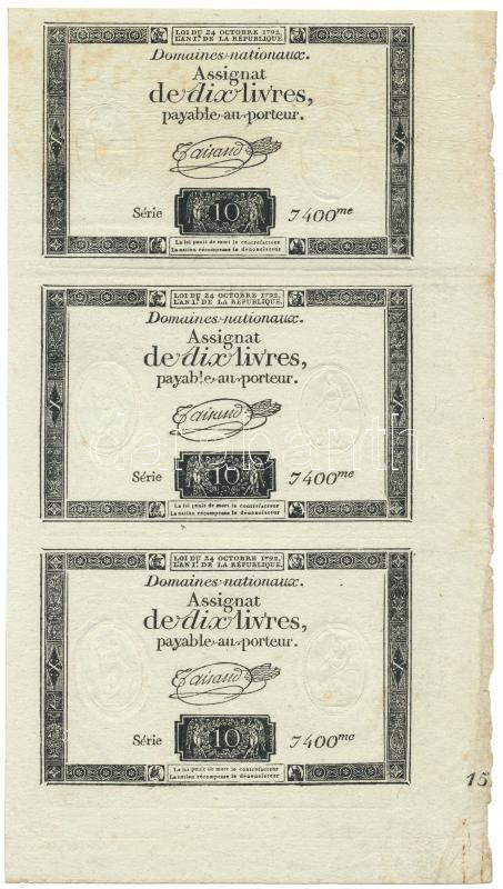 Franciaország 1792. 10L "Assignata" "7400" ívben 3db, vízjellel és szárazpecséttel T:F