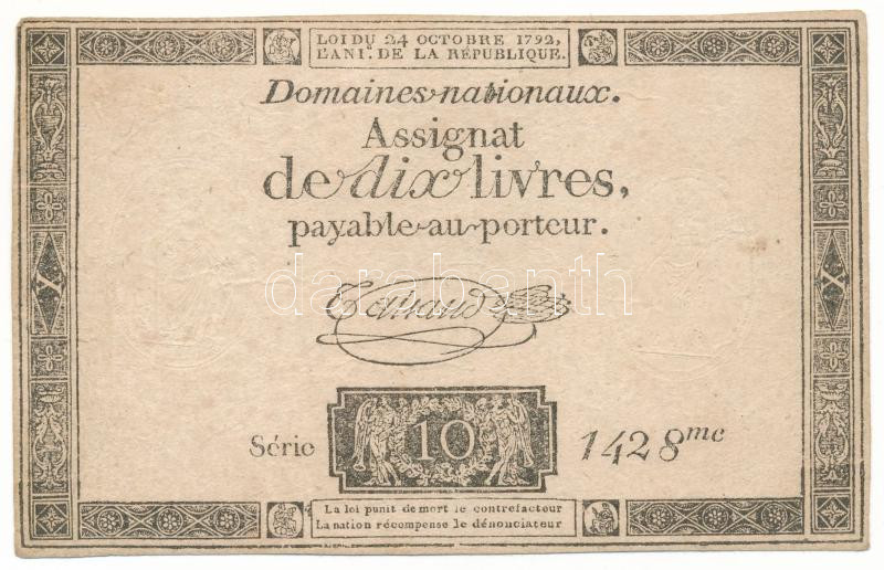 Franciaország 1792. 10L "Assignata" vízjellel és szárazpecséttel "1428" T:F