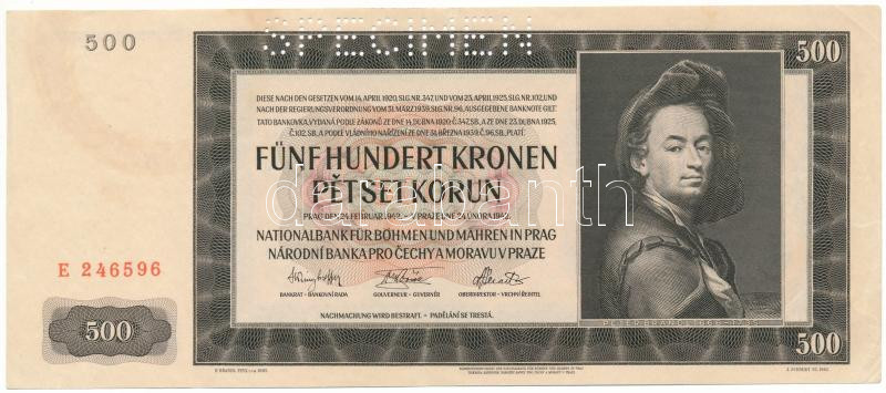 Német Harmadik Birodalom / Cseh-Morva Protektorátus 1942. 500K "SPECIMEN" perforációval, "E 246596" T:XF fo.
