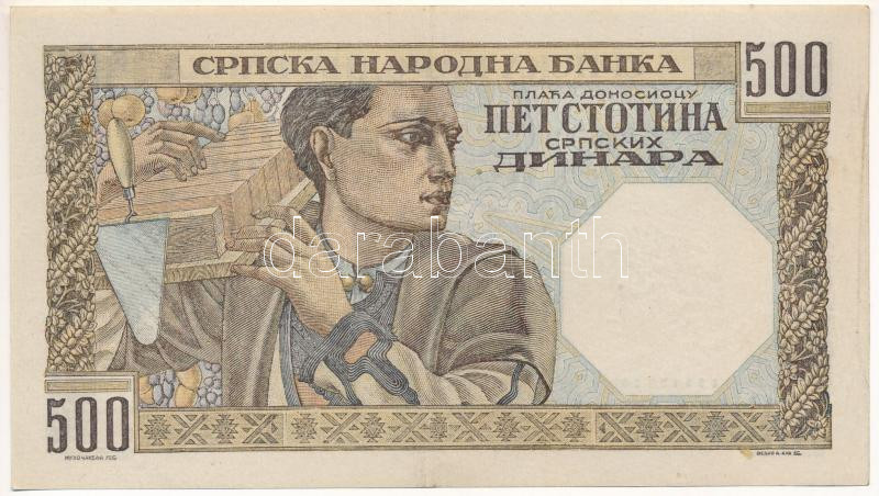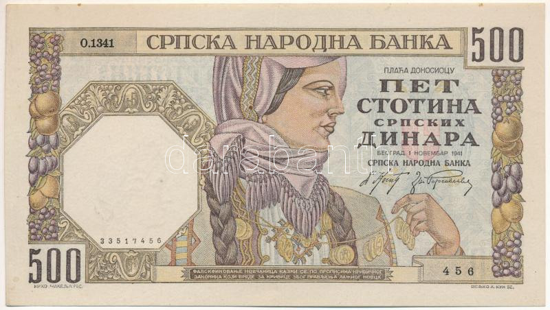 Szerbia 1941. Német megszállás 500D "O.1341 456", (Női fej (Quintus Horatius Flaccus) vízjellel) T:F, szép papír