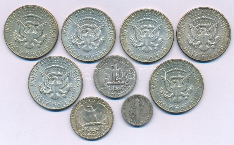 Amerikai Egyesült Államok 1941-1964. 1/4$ (25c) Ag "Washington" (2xklf) + 1942. 1d (10c) Ag "Mercury" + 1966. 1/2$ Ag "Kennedy" + 1966. 1/2$ Ag "Kennedy" (3x) + 1966. 1/2$ Ag "Kennedy" + 1966. 1/2$ Ag "Kennedy" T:AU-VF patina